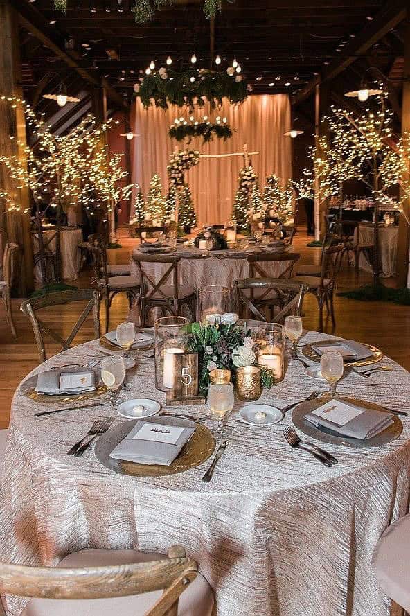 The shimmering texture of the champagne tablecloth reflects the light from the surrounding fairy-lit trees, creating a truly ethereal atmosphere. A lush greenery centerpiece punctuated with white roses sits at the heart of the table, grounded by a rustic wooden table number that honors the barn venue’s heritage. This design is proof that you can achieve a “fairytale” feel while staying true to a rustic setting.