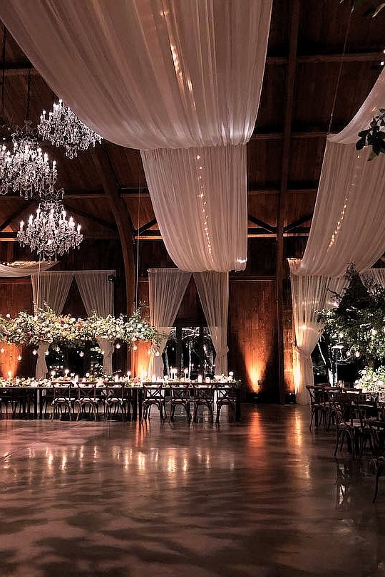 I think the way the light catches the fabric here creates a path of pure elegance, drawing your eye straight to the beautifully set tables beyond. It signals to your guests immediately that they are stepping out of the farm and into a fantasy.