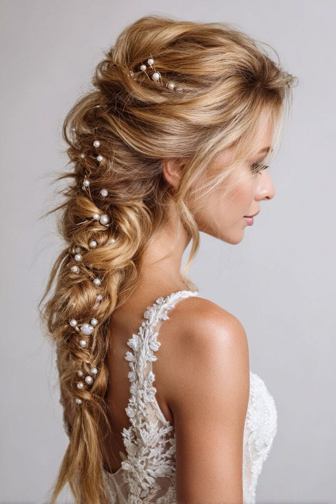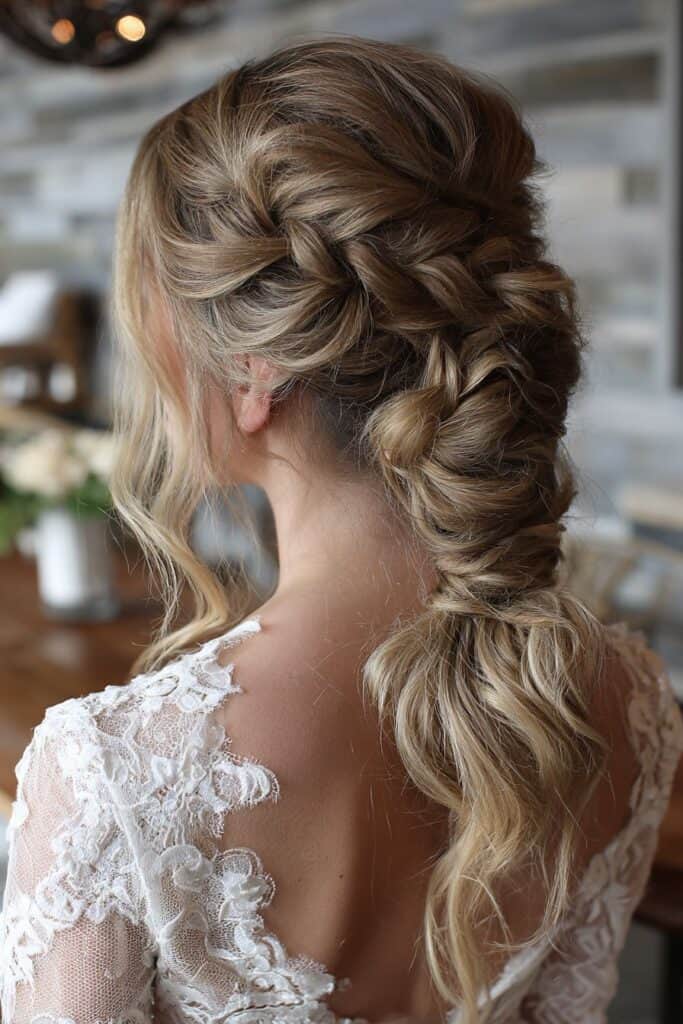 A thick, loosely woven fishtail braid, pulled apart for volume and texture, is a stunning choice. You can weave in small flowers or delicate vines for an extra touch.