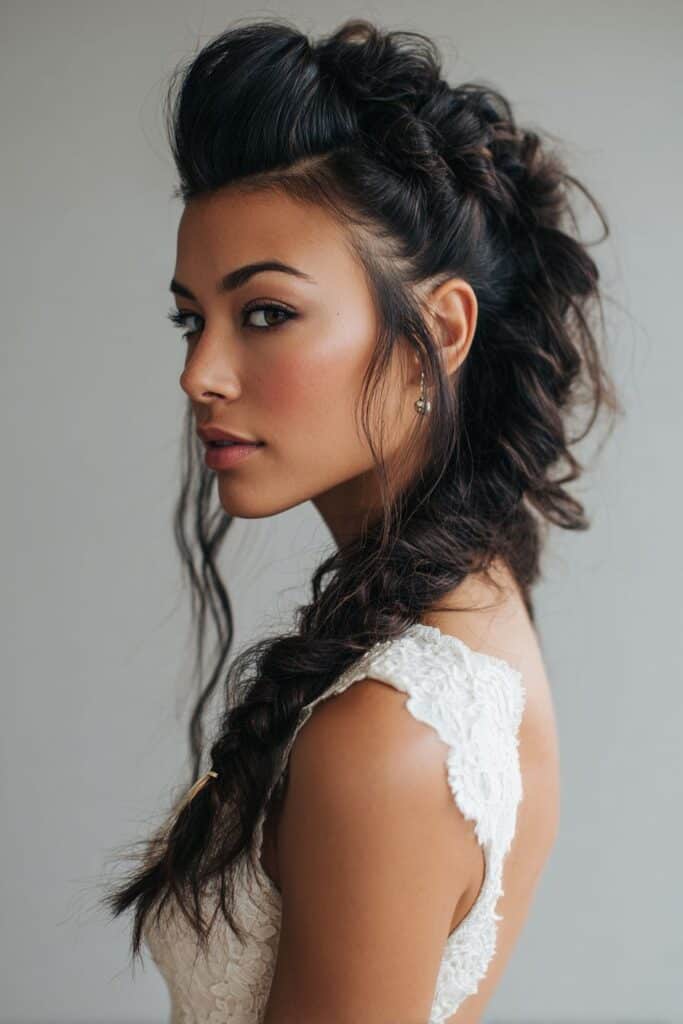 For the edgy boho bride, a voluminous braid down the center of your head, with the sides slicked back or kept very tight, creates a “faux hawk” effect.