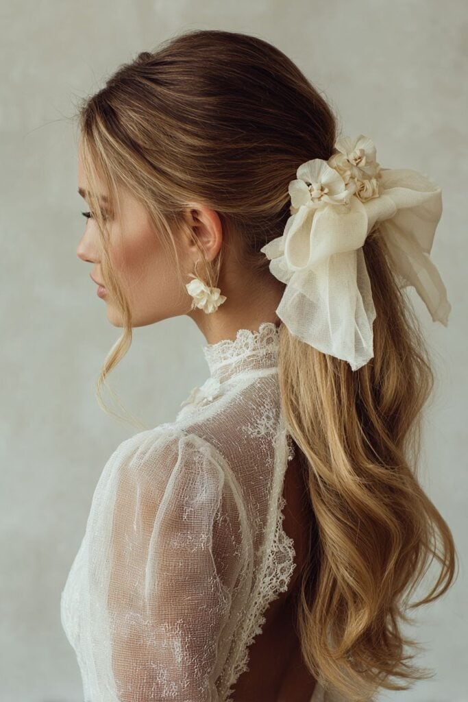 A simple, wavy low ponytail can be completely transformed with a large, statement bow made from silk, velvet, or organza.