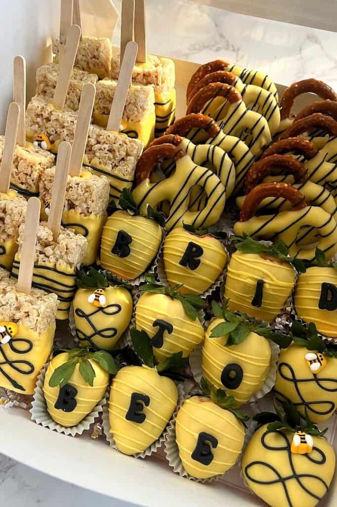 If you want to go the extra mile with your party favors or dessert distribution, custom treat boxes are a brilliant idea. You can fill small white boxes with bee-themed rice krispie treats, mini pretzels with yellow drizzle, and chocolate-covered strawberries spelling out sweet messages. It feels incredibly personalized and shows the bride just how much thought you put into her special day.