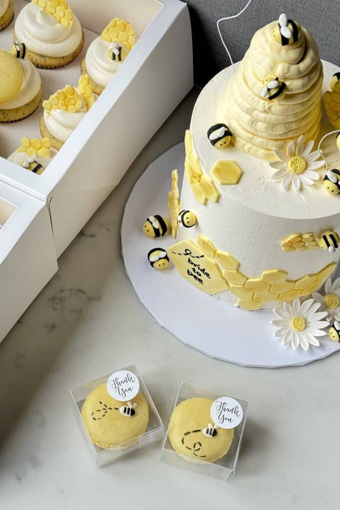 If honey jars aren’t your style, individually packaged macarons make for a highly sophisticated and delicious alternative. You can order yellow macarons decorated with delicate black flight paths and tiny bee icing details. Place them in clear, single-serve plastic boxes with a cute “Thank You” sticker for an effortless, high-end favor that your guests will adore.