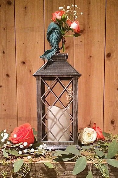 A weathered grey lantern takes center stage, topped with a unique teal textured wrap and a pop of bright coral roses. Set atop a rustic wooden base with sprawling eucalyptus, this piece offers a beautiful contrast between industrial metal and soft, vibrant nature.
