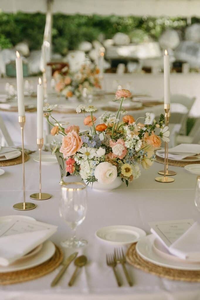 This centerpiece captures the essence of a bright spring day with its airy mix of peach roses, white daisies, and delicate blue accent flowers. The low-profile white bowl allows the golden taper candles to stand tall, adding a touch of classic elegance to the rustic textures of the woven chargers.