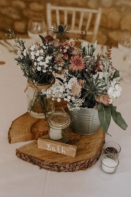 This eclectic arrangement features a silver bucket and glass jars filled with thistle, white waxflowers, and dusty pink blooms. Resting on a multi-tiered wood slice base, the setup includes a custom wooden table sign, adding a personalized touch to the rustic decor.