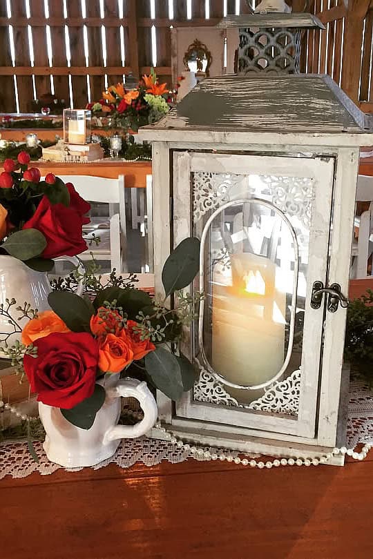 A distressed white wooden lantern serves as the focal point, featuring intricate lace-like carvings and a glowing candle inside. Surrounding the lantern are petite white pitchers filled with vibrant orange and red roses, all resting on a delicate lace runner.
