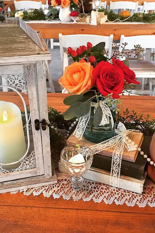 This nostalgic arrangement features a whitewashed wooden lantern paired with a stack of old vintage books tied with lace. A simple blue glass jar with bright roses and a plump fabric pumpkin complete this heartwarming, storyteller-inspired centerpiece.