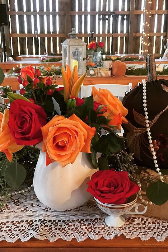 Embracing a true country aesthetic, this setup features a white ceramic pitcher filled with vibrant orange and red roses. A velvet-textured pumpkin wrapped in pearls and a delicate lace runner bring a sense of “shabby chic” luxury to the rustic wooden farmhouse table.