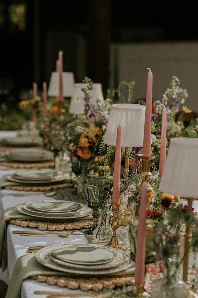 This stunning long-table arrangement feels like a sophisticated garden party brought indoors. The combination of slender pink taper candles, petite white lampshades, and a lush runner of wildflowers creates a multi-layered look that is both playful and incredibly refined.