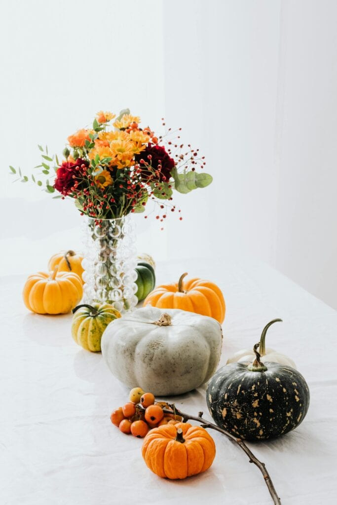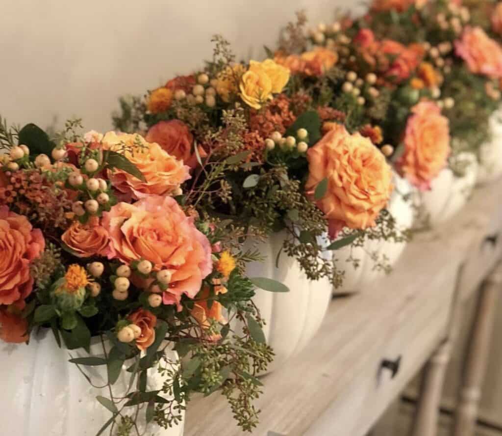 Helpful Tip: Use faux pumpkins and flowers if you need to prepare the centerpieces well in advance to avoid any wilting or decay.