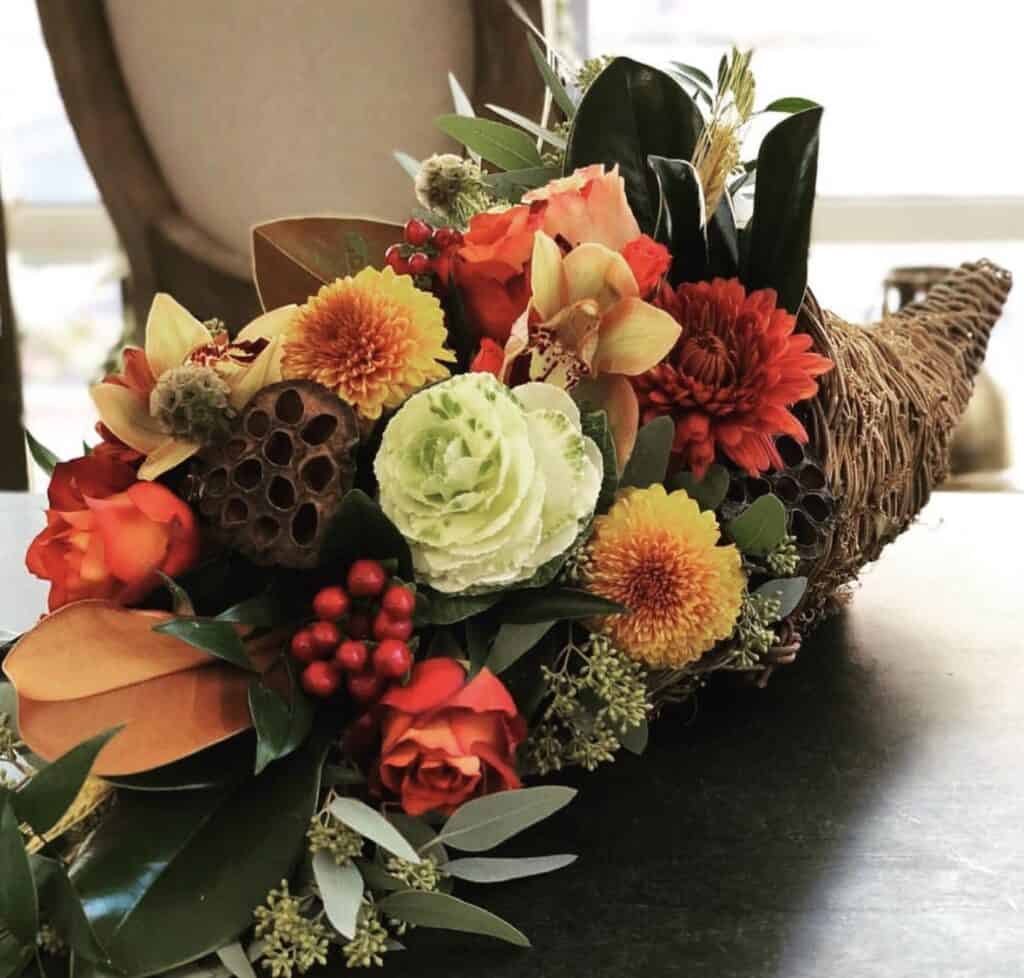 A fall wedding centerpiece with an overflowing cornucopia containing flowers, and foliage.