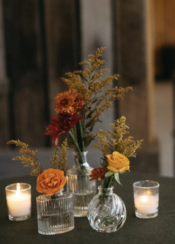 A fall wedding centerpiece consisting of three varying glass vases with fall colored flowers can be a simple but elegant look.