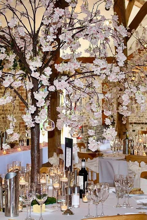Sometimes, you want a feeling that’s more light and airy. Cherry blossoms bring a romantic energy to a room that standard greenery just can’t quite match. These trees act as living sculptures, providing both soft color and a unique structural element to the reception layout. They are particularly stunning when you light them from below—it makes every delicate petal glow. It’s pure fairytale.