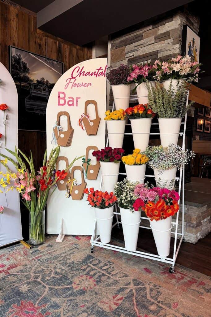 - Personal touch: Add a custom arched sign with the bride’s name, like “Sarah’s Flower Bar,” to make it extra special.