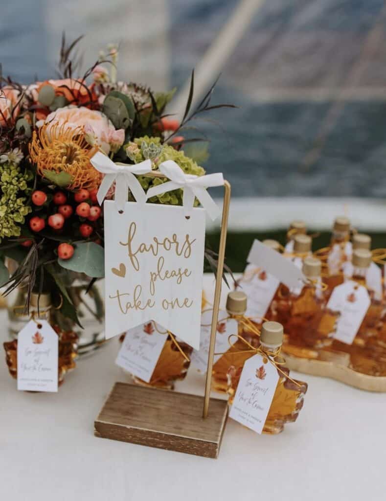 Thank your guests with seasonal favors. Mini bottles of maple syrup or mulled wine spices sachets are practical and on-theme.