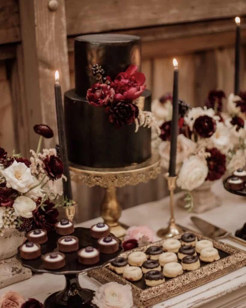 Extend your theme to your desserts. A table featuring dark chocolate treats, blackberry tarts, and a cake with black buttercream or fondant can be visually stunning and delicious.