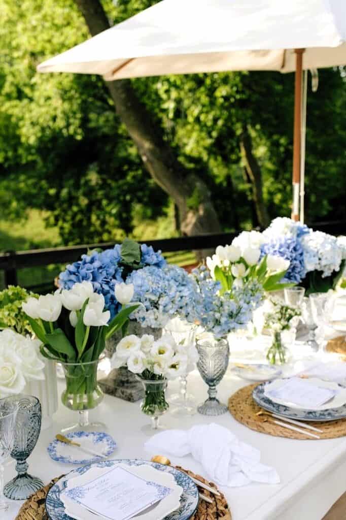 For example, this beautifully set outdoor dining table bathed in natural light, featuring a long white tablecloth and a lush centerpiece of white tulips and blue hydrangeas in clear vases.