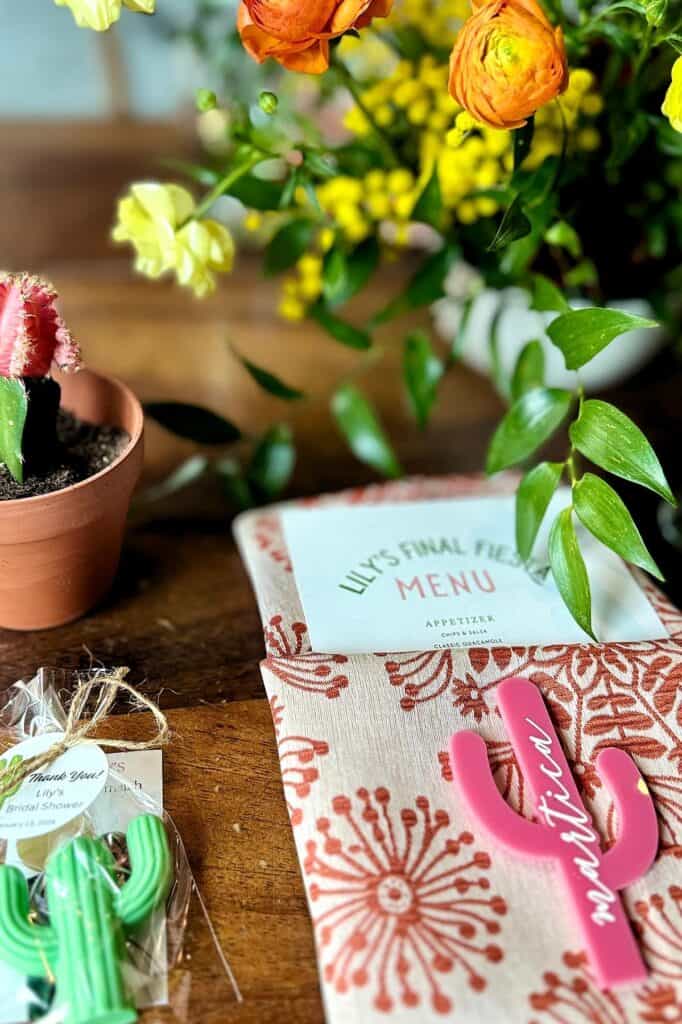 Clever signage guides your guests and adds personality to the event. A beautiful cursive sign reading “Final Fiesta” or “Taco Bout Love” looks incredible against a photo backdrop. I always look for laser-cut wood or bright acrylic options.